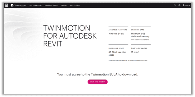 Clicking Access on Twinmotion will take you to the Epic Games Twinmotion Page, where you will need to View and Accept the End User License Agreement (EULA), before being able to Download and Run the Twinmotion installer.